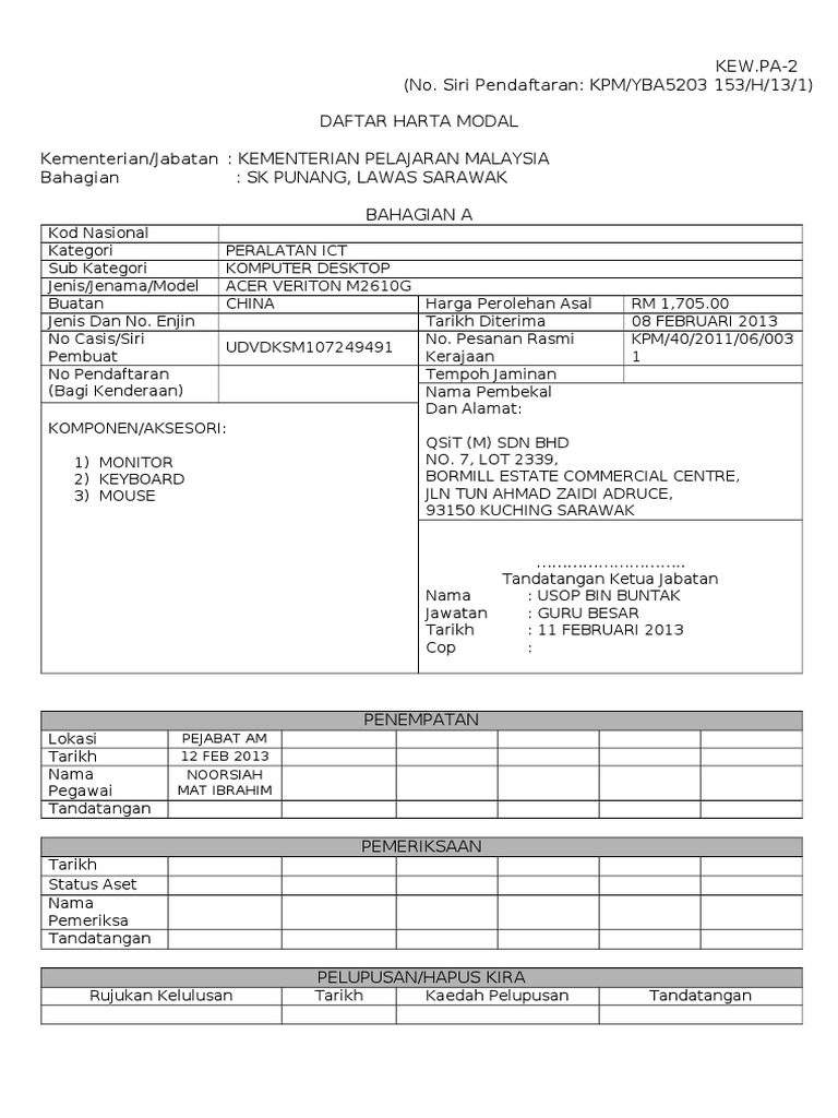 Jenis aset keterangan aset nombor siri pendaftaran kos penyelenggaraan terdahulu (jika ada) 5. Sijil lahir/borang daftar harta modal bagi peralatan yang hendak… a. Pastikan borang daftar harta tetap (kew. Pa ( pengurusan aset alih kerajaan ) bil. (ii) memupuk sikap saying akan buku teks spbt kepada anak/ tanggungan mereka.