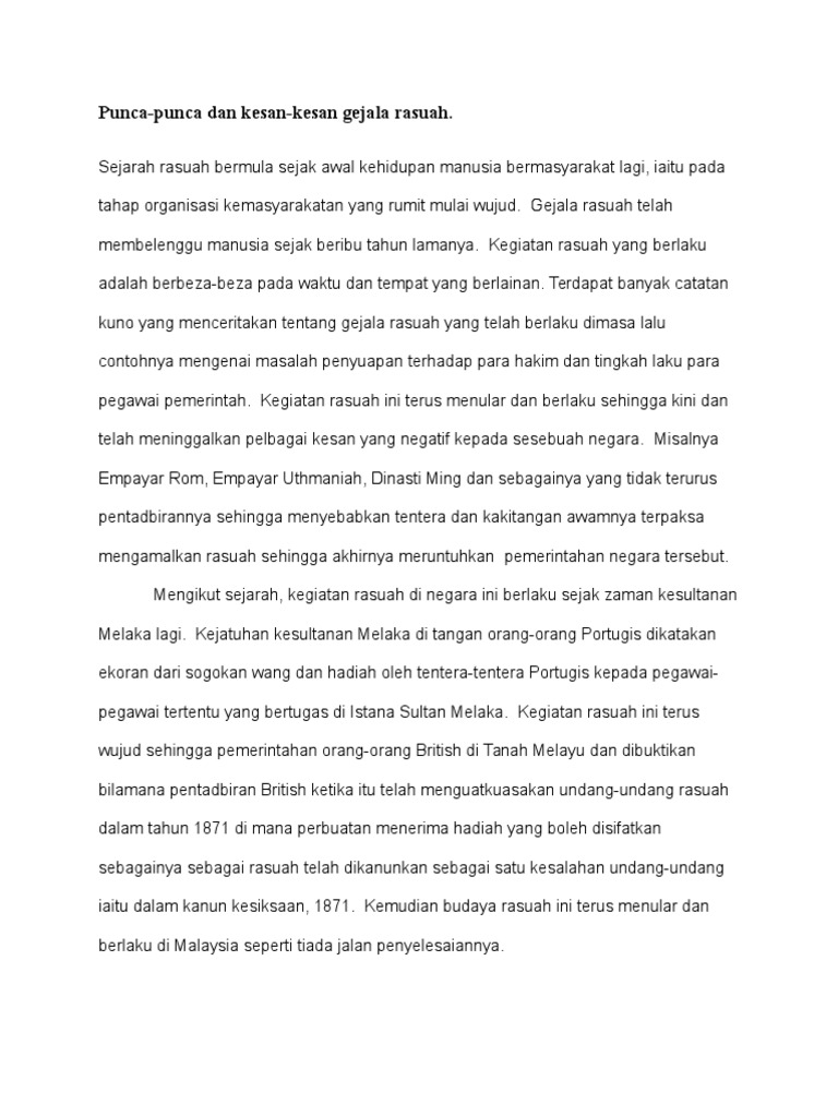 Punca B Kesan Rasuah from imgv2-2-f.scribdassets.com Berlaku ketidakadilan dalam masyarakat (golongan miskin/sederhana ditindas. Rasuah merupakan gejala yang sinonium dengan masyarakat kita pada hari ini. Demikian juga dengan pemerintahan kecamatan yang merupakan ujung tombak pertama dalam pemberian pelayanan kepada masyarakat. Oleh itu, segala usaha mesti disatukan oleh masyarakat, negara dan individu untuk mengatasinya. Budaya rasuah juga boleh menghancurkan. Allah dah rasul melaknat pemberi dan penerima rasuah. Kegiatan rasuah semakin berleluasa di negara kita dan menjadi ancaman kepada imej negara. Khairul azhar idris (2005) menyatakan bahawa pada hakikatnya gejala rasuah dilihat sebagai satu jalan pintas dan mudah bagi.